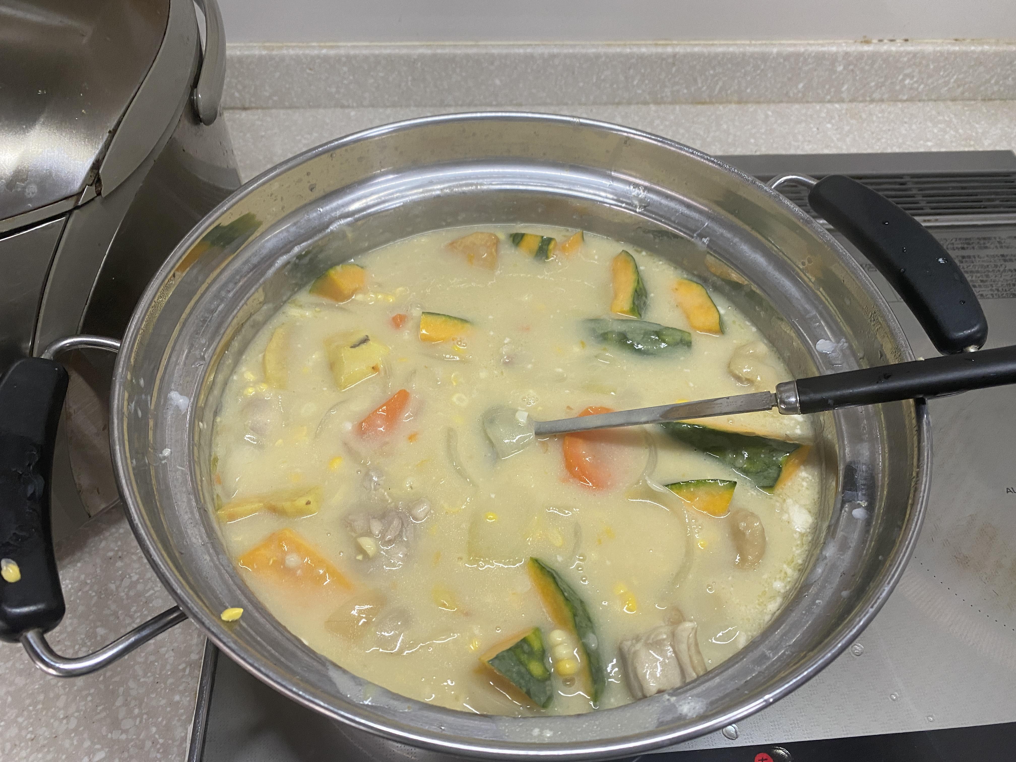 ジャガイモの代わりに宇宙芋で変わり種でなかなかの味で 他は、皮ごと生で冷凍しておいた🌽・カボチャ・玉ねぎ・人参・鶏肉が入ってます。 鶏肉以外は、全てお局ファームで採れたもの